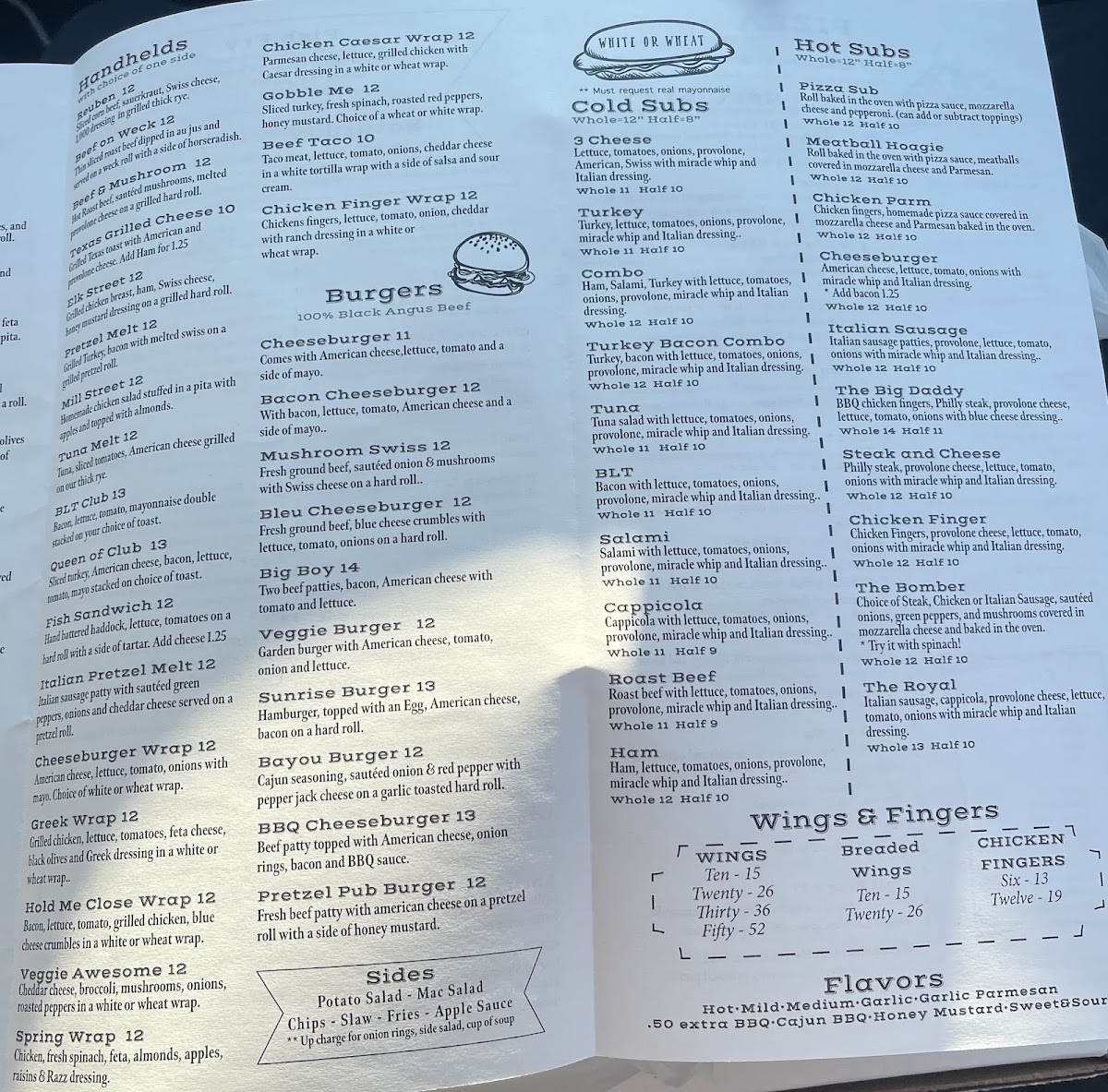 Guests can enjoy classic pizzas like cheese and pepperoni or cheese and mushroom, alongside generous subs such as chicken finger and steak and spinach. Lighter options and sides—like soups, chicken wings with ranch, and crispy fries—round out the menu, making it easy to find something for everyone.